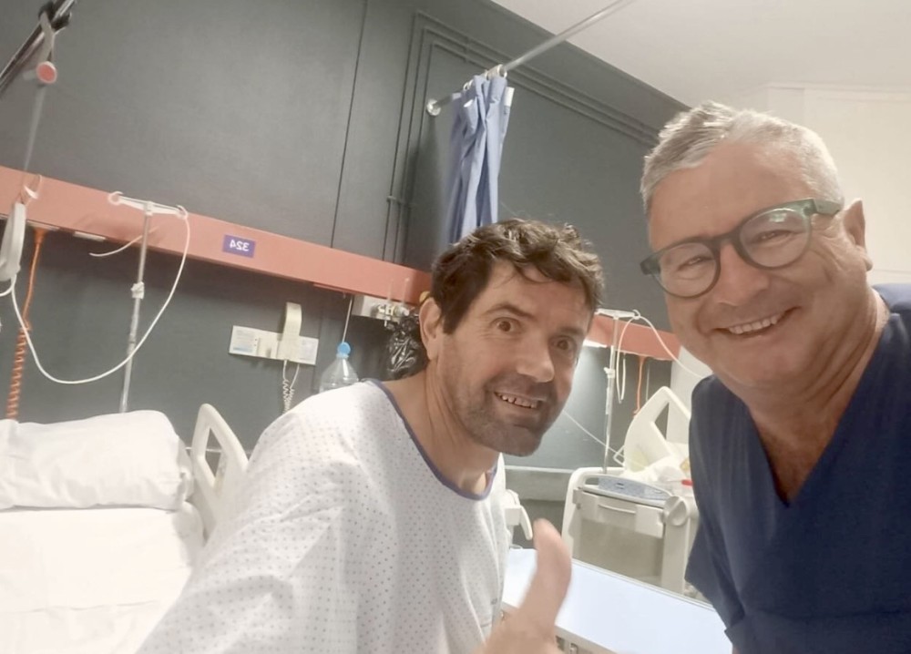 Zigor en el hospital con Oscar Alvarez, organizador de la Santurce a Bilbao y celador en el hospital de Basurto.